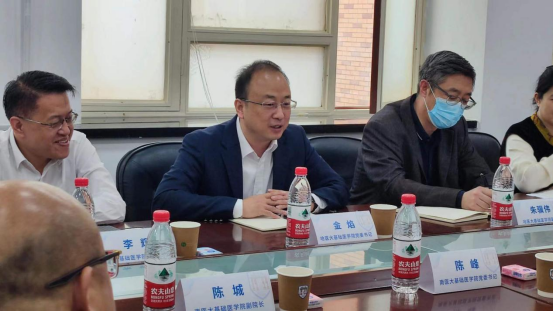 2023年9月26日上午,南京医科大学基础医学院党委书记陈峰、院长苏川等一行十一人来访学院进行座谈交流。学院党委书记金焰、党委副书记李辉等十四人出席座谈会。