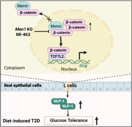 图1.Menin参与肠道GLP-1的分泌表达与血糖调控的作用机制图
