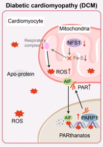 DCM是2型糖尿病的主要并发症之一,与糖脂代谢紊乱、线粒体功能障碍及氧化应激密切相关。本研究通过多组学分析发现,导致Fe-S合成受阻,这一缺陷直接影响了依赖Fe-S的线粒体功能蛋白(如顺乌头酸酶mAco、琥珀酸脱氢酶SDHB)和DNA修复酶(XPD)的表达及活性,引发能量代谢紊乱与氧化应激加剧。在高糖高脂环境下,Fe-S缺失进一步放大了线粒体活性氧(ROS)积累和DNA氧化损伤,进而过度激活PARP1通路,促进凋亡诱导因子(AIF)核转位,最终通过PARthanatos途径触发心肌细胞死亡。