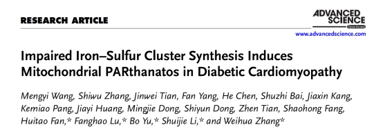 2024年11月4日,ac米兰官网中文网站基础医学院病理生理教研室张伟华教授团队在Advanced Science杂志发表题为《Impaired Iron-Sulfur Cluster Synthesis Induces Mitochondrial PARthanatos in Diabetic Cardiomyopathy》(Adv.Sci.2024,IF:14.3)的研究论文。该研究首次阐明糖尿病心肌病(DCM)中线粒体铁硫簇(Fe-S)合成缺陷通过触发PARP1依赖性细胞死亡(PARthanatos)导致心肌损伤的分子机制,并提出硫化氢(H2S)干预可作为潜在治疗策略。