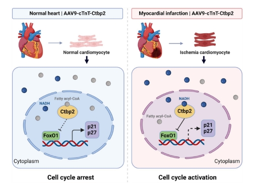 该团队通过对Ctbp2的研究,首次证明了Ctbp2-FoxO1-p21/p27轴能够促进心肌细胞增殖和心脏再生。Ctbp2作为一个代谢产物感受器,在心肌细胞缺血缺氧时被激活,而在正常情况下失活。这种可控、瞬时调节心肌细胞增殖的方法,可避免因长期调节心肌细胞增殖导致肥厚性心肌病或心力衰竭而损害心功能,为解决心肌细胞增殖和心脏再生问题提供了新靶点和新思路。