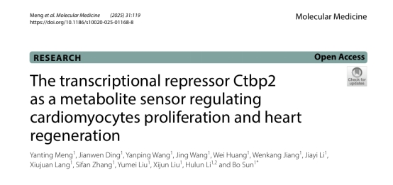 ac米兰官网中文网站基础医学院神经生物学教研室李呼伦教授和孙博教授团队研究揭示了Ctbp2通过调控心肌细胞增殖参与心肌梗死后心肌细胞再生的相关机制。2025年3月26日,该研究团队的研究成果以题为《The transcriptional repressor Ctbp2 as a metabolite sensor regulating cardiomyocytes proliferation and heart regeneration》的论文形式发表于国际权威学术期刊《Molecular Medicine》(2025,IF:6.0)。