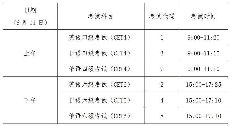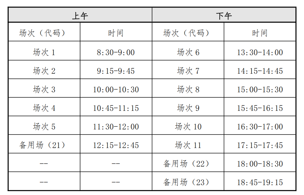 英语四级口语考试(CET-SET4)考试时间为5月21日(F221次),英语六级口语考试(CET-SET6)考试时间为5月22日(S222次),具体场次安排如下: