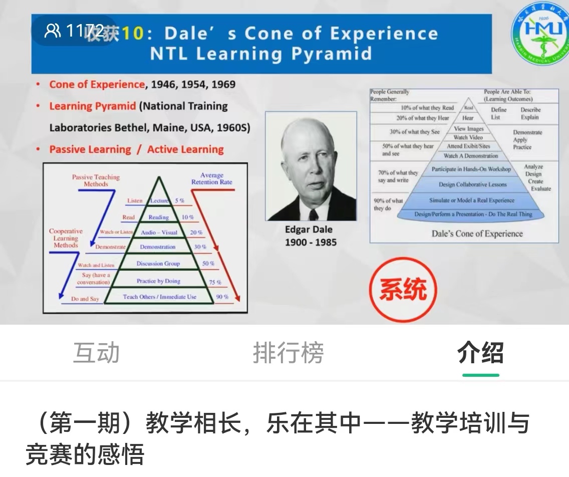 在讲座中,任守双教授回顾了参加学校组织教学培训的收获,并结合培训学习内容深度剖析了既往6次参赛经历的收获与可进一步提升的措施。任守双教授结合实践分别在学情分析、注意力曲线、重置曲线、效能曲线、布鲁姆教育目标分类、BOPPPS教学模式、以学生为中心的教学设计等14个方面进行了讲解,并阐述了自己对好课的认识,在参加教学竞赛的基础不断学习,不断追求教学上的进步,并以科研反哺教学,最终实现不断提升教学质量。