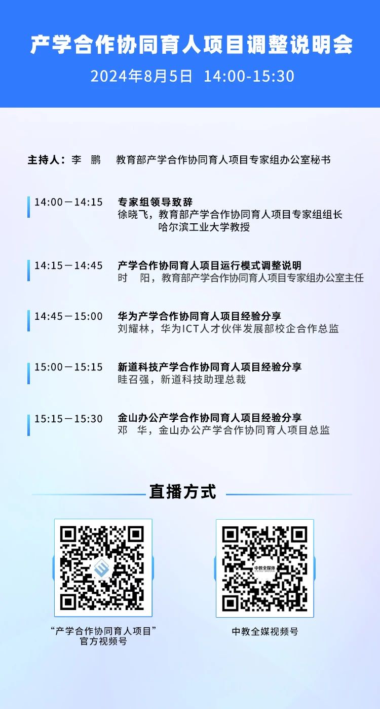 为帮助高校、企业更全面地了解《教育部产学合作协同育人项目管理办法》(教高厅〔2021〕1号)及《教育部高等教育司关于调整产学合作协同育人项目运行模式及征集2024年产学合作协同育人项目的通知》,促进校企持续深入对接,更好地准备项目申报,教育部产学合作协同育人项目专家组定于2024年8月5日下午14:00—15:30 召开项目调整线上说明会。