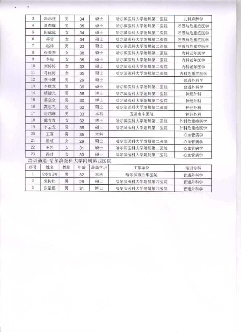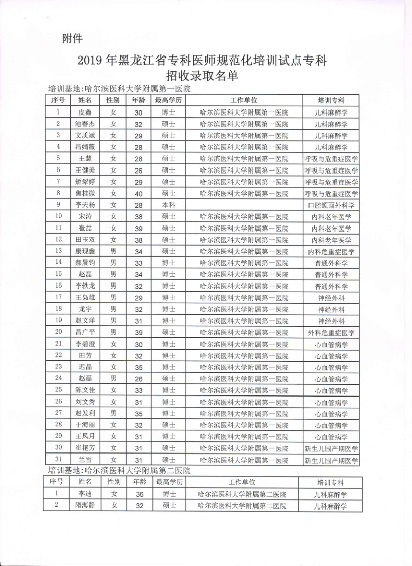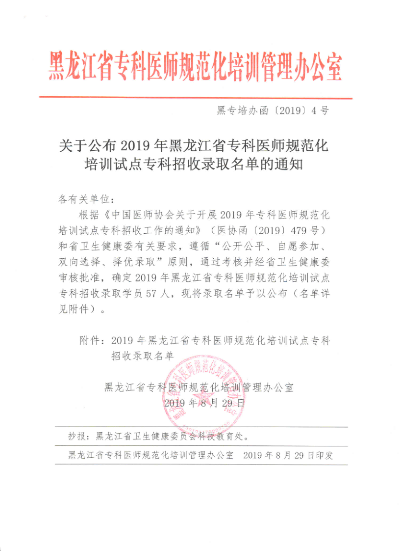 《关于公布2019年黑龙江省专科医师规范化培训试点专科招收录取名单的通知》(黑专培办函〔2019〕4号)