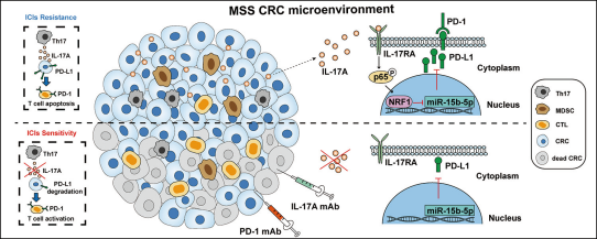 图1. MSS型肠癌中封闭IL-17A增敏免疫治疗的机制模式图