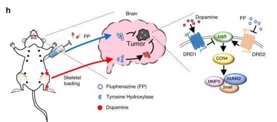 众所周知,骨骼所受机械负荷可促进骨内环境稳定和抑制肿瘤诱导的骨溶解。然而,负重的后肢是否对远端肿瘤的生长造成影响仍不得而知。本研究通过研究肿瘤细胞对Lrp5介导的WNT信号和多巴胺的反应,探讨了骨-脑机械转导的可能性。结果显示,在胫骨施加机械刺激后可增加脑内多巴胺合成限速酶-酪氨酸羟化酶的表达,并且显著减少脑肿瘤的进展。同时,应用巴胺调节剂氟非那嗪(FP),可增强对脑肿瘤抑制作用。多巴胺和FP分别通过多巴胺受体DRD1和DRD2发挥抗肿瘤作用。细胞因子阵列分析显示,CCN4的下调对于多巴胺介导的肿瘤抑制至关重要。Lrp5的沉默降低了CCN4的表达,从而抑制其下游致癌基因的表达,如MMP9、Runx2和Snail。综上所述,本研究证明,远端机械负荷可通过神经信号,抑制大脑中Lrp5-CCN4通路,调节多巴胺能信号,抑制脑肿瘤的发生发展,将物理治疗以及药物治疗相结合,有可能发展成为一种乳腺癌脑转移的治疗手段。