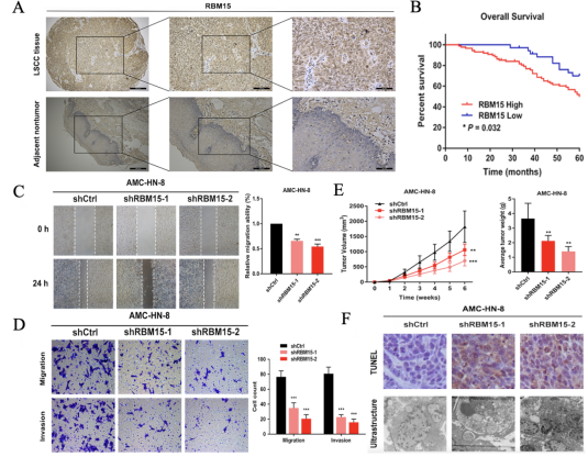图1. A-B. 免疫组化显示在喉鳞癌组织中RBM15表达水平显著高于癌旁组织,且RBM15高表达的患者生存时间较短;C-D. 敲低RBM15表达后,喉鳞癌细胞的迁移及侵袭能力显著下降;E. 体内实验证实,敲低RBM15表达后,移植瘤体积和重量显著减少;F. TUNEL染色和透射电镜观察细胞凋亡,在RBM15敲减组中观察到典型的细胞凋亡形态。