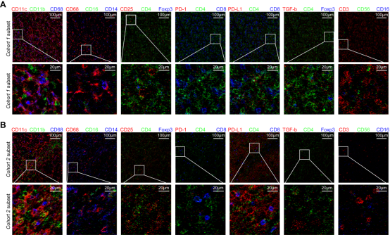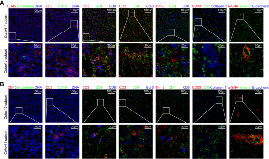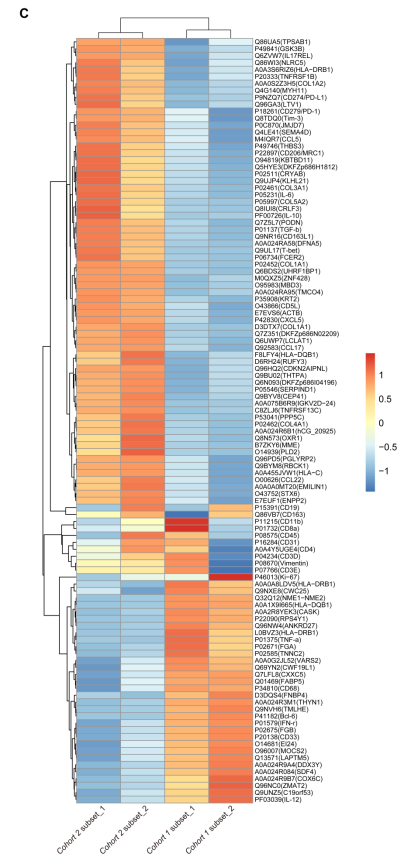 A-B:MIBI-TOF组织原位成像不同表型的免疫细胞。C:蛋白质组学热图展示免疫相关蛋白的差异性表达。Cohort 1:H. pylori感染阳性且有较好应答及高的TILs人群;Cohort 2:其他患者人群。