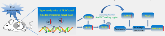 机体生物节律是调节机体代谢稳态的重要生物学机制之一。目前除24小时昼夜变化外,其它可以调节生物节律的因素是否存在尚不清楚。营养与食品卫生学团队,利用前期建立的人群饥荒队列数据发现,生命早期经历过宫内营养不良人群,成年期睡眠时间、夜间褪黑素分泌水平显著低于对照人群。利用850K甲基化芯片测序技术,筛选到PRKCA和CREB1基因启动子区发生了高甲基化改变。利用体内外实验,进一步证明,宫内营养不良可以通过上调PRKCA和CREB1甲基化水平,导致松果体褪黑素分泌功能障碍,导致节律紊乱,表明成年期生物节律紊乱部分根植于子宫内营养状况。
