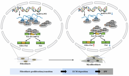 本研究中,研究者发现lncRNA NONMMUT060091(PFI)在小鼠肺纤维化和活化的人肺成纤维细胞中显著降低,过表达PFI减轻TGF-β1诱导的成纤维细胞活化及博来霉素诱导的小鼠肺纤维化。通过ChRIP-MS技术探究与PFI相结合的蛋白,GO及KEGG分析表明PFI与RNA剪接事件高度相关。质谱分析结果及western blot结果提示PFI通过结合和调节富含丝氨酸/精氨酸的剪接因子1(SRSF1)的蛋白表达参与肺纤维化。进一步通过在体及离体实验发现:lncRNA PFI通过与SRSF1结合并抑制SRSF1的表达,抑制EDA-Fn1剪接异构体的产生,参与肺纤维化进程,过表达PFI或敲减SRSF1可能是肺纤维化的潜在治疗策略。