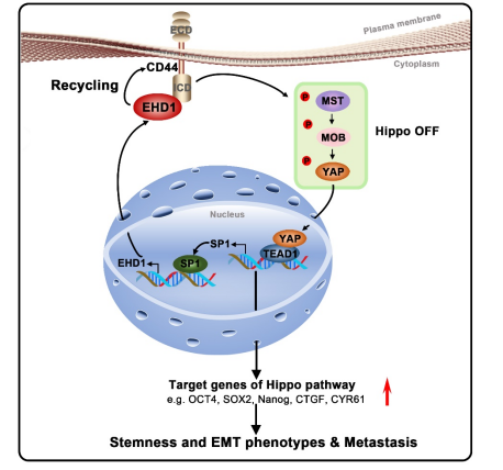 蔡莉教授团队报道了哺乳动物Eps15同源结构域蛋白1(Eps15 homology domain protein 1,EHD1)作为内吞转移相关基因(Endocytic and metastasis-associated genes,EMGs),以EH区段(EHD1-EH)与CD44蛋白的胞内段(CD44-intracellular domain, CD44-ICD)特异性结合,促进CD44蛋白内吞循环从而增强CD44蛋白稳定性。上调的CD44抑制Hippo信号通路的激活,导致去磷酸化的YAP异位入核,激活下游靶基因(即调控干性和/或EMT的基因,OCT4、SOX2、Nanog、CTGF和CYR61)表达,从而EHD1增强CSCs样特性、EMT最终促进LUAD细胞的转移。此外,课题组还发现SP1作为Hippo信号通路的下游靶点,又是EHD1的转录因子,同时SP1具有促进LUAD转移、CSCs样特性、EMT,以及调控CD44和Hippo信号通路的能力,由此课题组揭示EHD1/CD44/Hippo/SP1正反馈环路存在,并且该正反馈环路导致持续的Hippo信号失活,最终促进LUAD的CSCs样特性和转移。该研究首次发现EHD1能促进CD44内吞循环,同时,揭示了一种新的促转移调控信号,即EHD1/CD44/Hippo/SP1正反馈环路,最终促进多个转移基因表达。