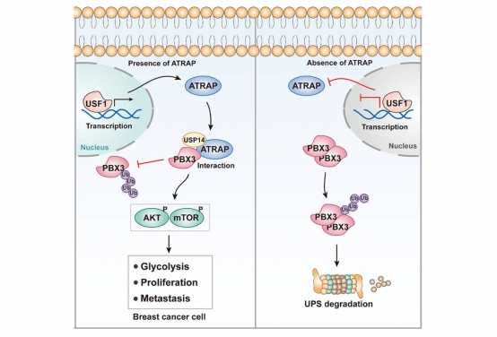陈雪松课题组国际上首次发现血管紧张素Ⅱ受体相关蛋白(ATRAP)在乳腺肿瘤中的作用并阐明了机制。研究发现ATRAP在乳腺癌组织中表达上调,ATRAP高表达的乳腺癌患者预后不佳;ATRAP能够通过激活AKT/mTOR通路促进乳腺癌恶行表型,USF1可以与ATRAP启动子结合参与ATRAP的转录调控;ATRAP能与PBX3结合并去泛素化稳定PBX3蛋白;ATRAP能与USP14相互作用参与调控PBX3的去泛素化促进肿瘤进展。本研究加深了我们对乳腺癌进展机制的理解,该途径有望成为乳腺癌治疗的新靶点。