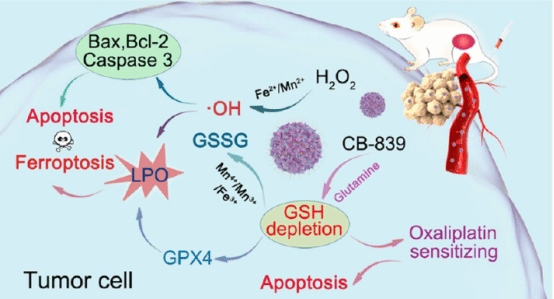 张艳桥教授团队与哈尔滨工程大学杨飘萍教授合作,采用枝状介孔二氧化硅纳米颗粒(DMSNs)作为纳米载体,将超小的Fe3O4纳米颗粒、Mn离子和谷氨酰胺酶抑制剂(CB-839)整合到DMSNs的孔中,形成DMSN/Fe3O4-Mn@CB-839 (DFMC)纳米药物。这种纳米药物在酸性条件下表现出类过氧化物酶的活性,催化过氧化氢(H2O2)分解为羟基自由基(·OH),也促进了细胞发生铁死亡所需的脂质过氧化物的形成。此外,该纳米药物还可以消耗肿瘤微环境中的GSH,从而增强活性氧(ROS)介导的肿瘤催化治疗。引入的CB-839阻断了内源性GSH的合成,进一步增强了GSH的耗竭性能,从而减少了肿瘤细胞对奥沙利铂(GSH相关耐药)的排泄,从而增强了奥沙利铂的化学敏感性。