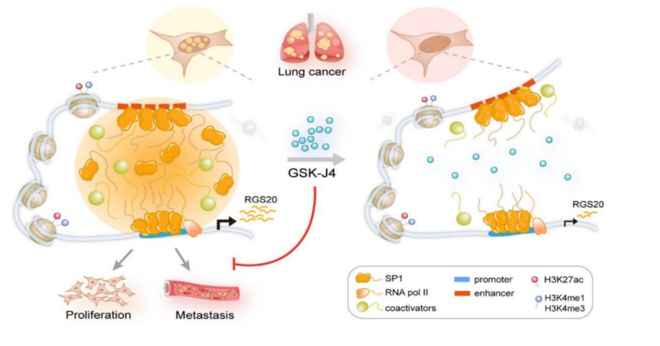 图1. 示意图显示SP1如何通过相分离和超级增强子激活RGS20表达并促进肺腺癌的发展。多种转录共激活因子可被招募到SP1介导的核凝聚物中,这些凝聚物可被GSK-J4破坏,以阻碍肺腺癌发展