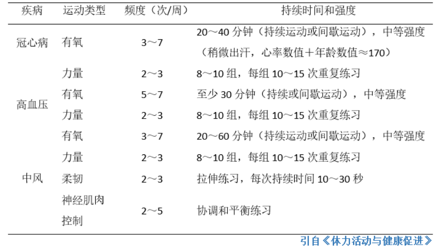 已有研究充分证明,长期适量体育锻炼能够有效改善血管功能,降低血压血脂、减少血栓和全身性炎症等。此外,运动健身还可以减轻焦虑、抑郁和情感压力,有效增强愉悦感、机体耐受力和人体自身免疫力。心血管疾病患者常用运动处方: