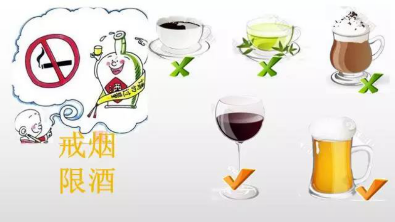 戒烟限酒 长期吸烟酗酒会干扰血脂代谢,导致血脂升高。香烟当中的烟碱、一氧化碳以及尼古丁等有害物质,会加速动脉血管硬化,增加心脑血管患者罹患脑中风风险。酒水中的酒精容易导致患者的血压升高、心跳速度加快,继而加速心血管疾病恶化。中老年人在日常生活中一定不要吸烟酗酒,也不要喝浓茶、浓咖啡等一些刺激性的饮品。少量饮啤酒、黄酒、葡萄酒等低度酒可促进血脉流通,气血调和,注意适量,不能喝烈性酒。
