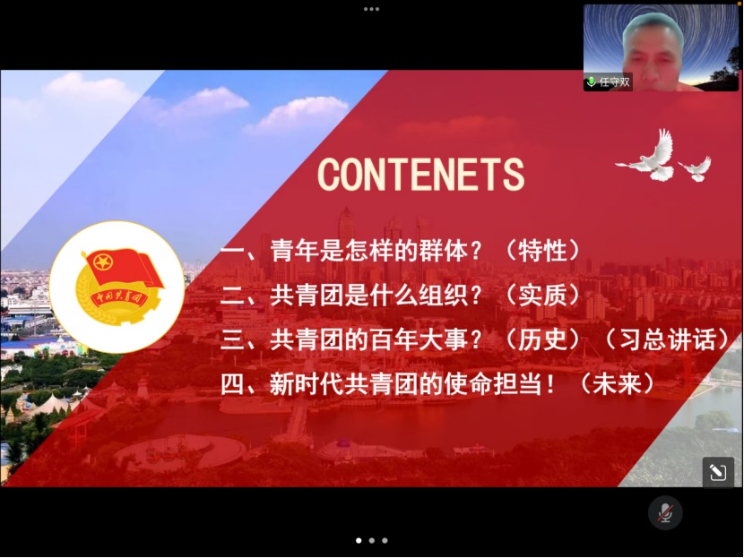 任守双教授的讲座分为四个部分,首先从不同组织、不同群体对青年的定义出发,阐述了青年群体的特性;其次,介绍了少先队、共青团、共产党的区别,揭示了共青团组织的实质;再次,剖析历史并解读习近平总书记在庆祝中国共产主义青年团成立100周年大会上的讲话,向大家介绍了共青团在党领导下走过的百年历程,并以十层含义、系列金句和用典为切入点,带领大家深刻领会习近平总书记的重要讲话精神中党对青年一代的亲切关怀及对青年事业的高度重视;最后,任守双教授对青年教师提出期待,希望大家牢记习近平总书记的嘱托,做好新时代党的青年工作,以高质量党建带高质量团建,教育团结广大青年学生,赓续百年革命传统,不忘爱国爱党初心使命,始终成为民族的先锋、革命的先锋、时代的先锋,确保党的事业薪火相传,确保中华民族永续发展。