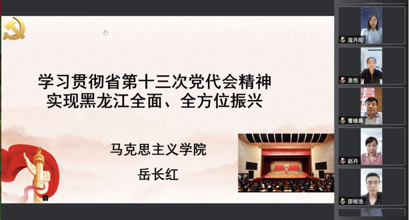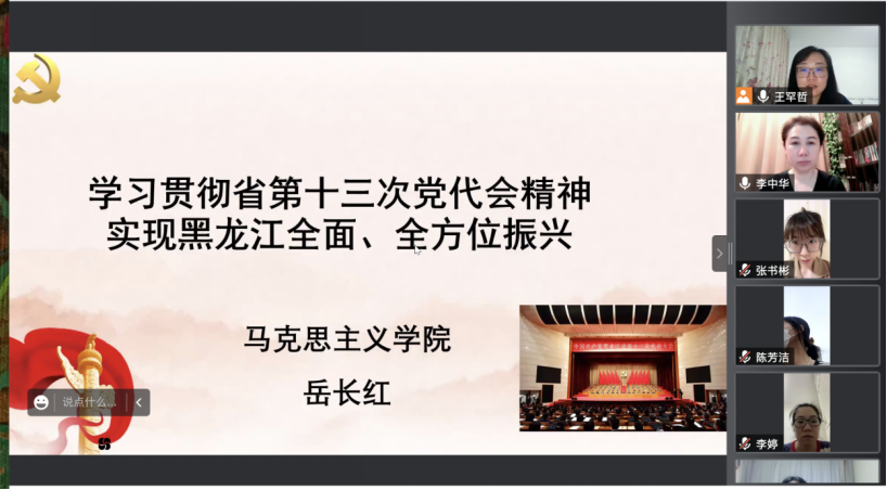 为深入学习宣传贯彻中国共产党黑龙江省第十三次代表大会精神,按照《省委教育工委关于在全省高校组织开展省第十三次党代会精神学习宣传“十个一”专项活动的通知》要求,6月10日晚,学院邀请岳长红教授在线上作题为《学习贯彻第十三次党代会精神 实现黑龙江全面、全方位振兴》的集中宣讲报告,马克思主义学院全体教职工参加本次讲座,李中华副院长主持宣讲会。