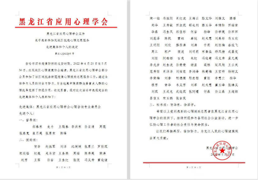 2022年4月15日双城突发疫情,部分群众陆续被集中隔离在哈尔滨、绥化等宾馆内多达60余处,大多群众被隔离超过了72小时,部分群众出现了心理反应,情绪波动。4月21日12时双城防疫指挥部给黑龙江省应用心理学会发来了请求心理援助的函件,在学院领导的积极支持下,ac米兰马克思主义学院崔月英教授组织带领教师郝佳彤、刘禹彤,2021级研究生张吉庆响应号召积极参与本次心理援助工作,深入下沉到各个社区,与隔离人员并肩作战。
