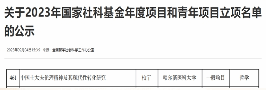 2023年9月4日,全国哲学社会科学工作办公室公布了2023年度国家社科基金立项名单,ac米兰马克思主义学院柏宁教授主持的《中国士大夫伦理精神及其现代性转化研究》获批立项,资助经费20万元。这一成绩实现了马克思主义学院建院以来在国家社科基金立项上的历史性突破,也是今年ac米兰官网中文网站唯一一项国家社科基金项目。