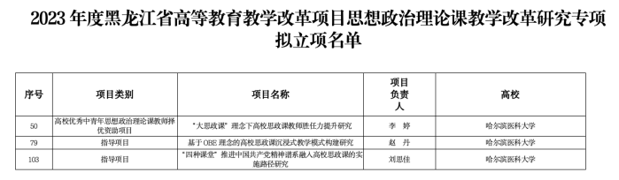 近日,黑龙江省教育厅下发了《2023年度黑龙江省高等教育教学改革项目思想政治理论课教学改革研究专项拟立项名单》,此次全省本、专科共计批准立项课题110项,重点项目10项、一般项目60项、指导项目40项。我院李婷老师的《“大思政课”理念下高校思政课教师胜任力提升研究》获批高校优秀中青年思想政治理论课教师择优资助项目;赵丹老师的《基于OBE理念的高校思政课沉浸式教学模式构建研究》、刘思佳老师的《“四种课堂”推进中国共产党精神谱系融入高校思政课的实施路径研究》分别获批指导项目,充分展现了学校马克思主义学院学科建设的实力和水平。