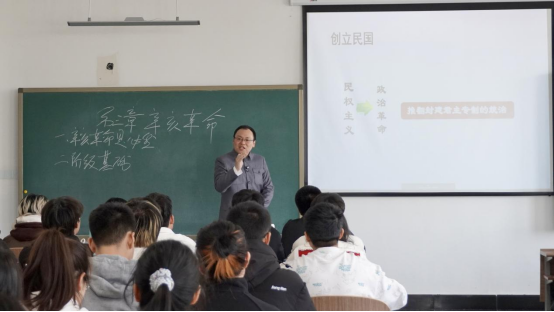 在此次教学活动中,中国近现代史纲要教研室于坤冬老师向学生讲授中国近现代史纲要第四专题《辛亥革命的成与败》。为了这节课的内容能更形象、生动地被同学们掌握,于坤冬老师特意穿着中山装进行现场展示讲解,通过中山装“三四五”的设计理念让同学们更深刻地记住辛亥革命的指导思想和政治主张,同时还创新性地运用音频导课、视频讲解以及雨课堂现场反馈等方式相结合的线上线下混合式教学模式,构建起多元互动的学习场景。学生们在多种教学方法的交融互动中,高效汲取知识,明确学习目标,逐步树立起正确的历史观与价值观。中国近现代史纲要教研室全体教师参与了此次课程展示活动,共同观摩研讨并开展教学法活动。