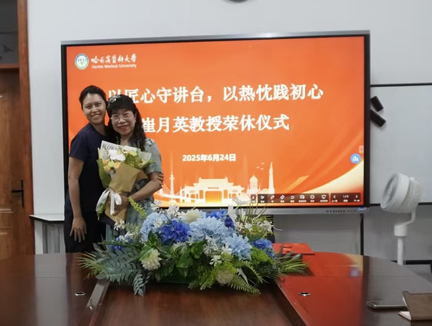 从受教于课堂的学子,到并肩耕耘的同事,作为崔月英教授昔日学生、如今的教研室同仁,郝佳彤手捧鲜花哽咽道:“求学时您为我点亮学术灯塔,工作后您带我深耕三尺讲台。这份亦师亦友的情谊,我会永远珍藏。愿您退休生活温暖如春!”随后,她将鲜花献给崔教授,现场响起经久不息的掌声。
