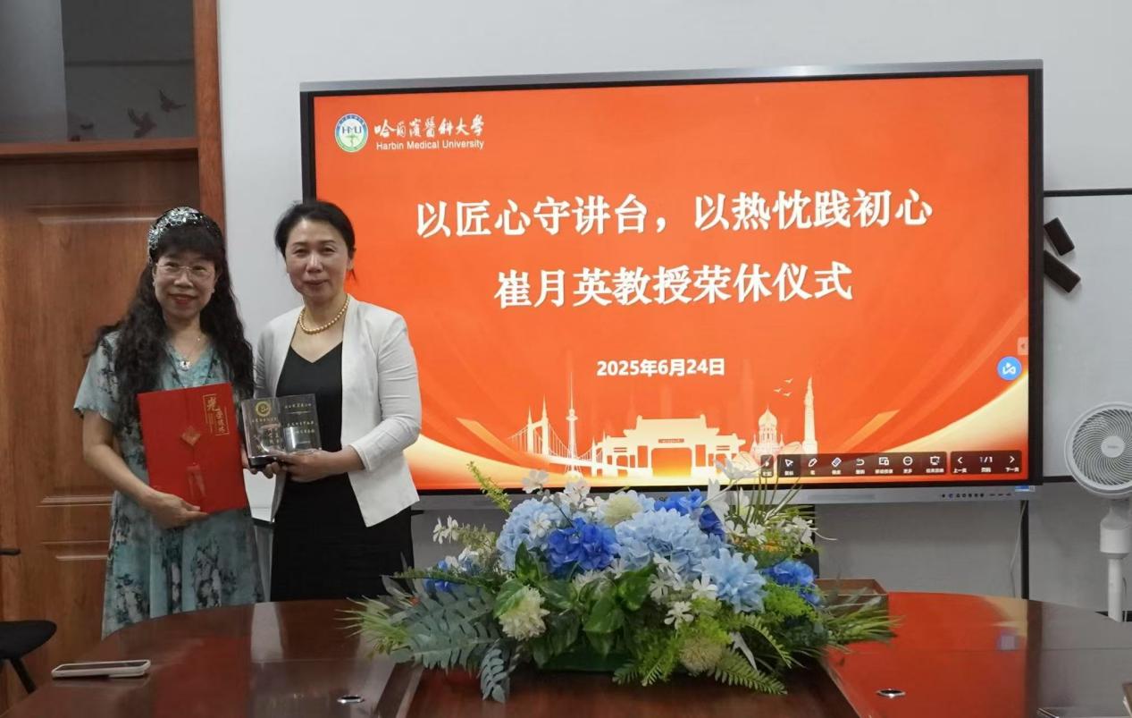 随后,在全场热烈的掌声中,院长李中华为崔月英教授颁发荣休证书与纪念品。这份承载着敬意与感激的荣誉,凝结着对她36载教育生涯、入党30年坚守初心的崇高礼赞。