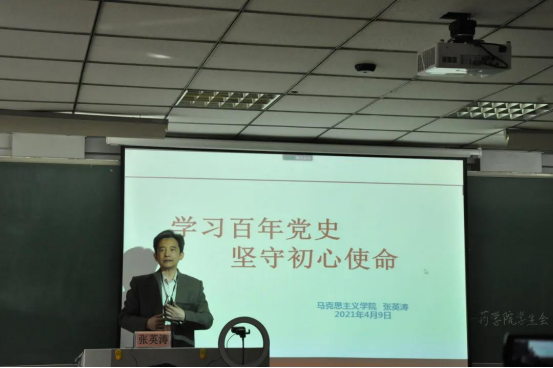 百年风霜雪雨,百年大浪淘沙。为深入贯彻落实党史学习教育相关文件精神,形成全民“学党史、知党史、明党史”的积极氛围。4月9日,马克思主义学院副院长张英涛教授,以《学习百年党史 坚守初心使命》为题,回顾中国共产党建党百年的光辉历程,为药学院全体师生带来一场党史知识和理想信念交融的精彩讲座。