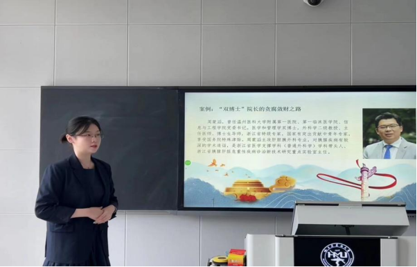 本次廉洁教育展共设置“中国共产党百年纪律建设”、“医疗廉洁篇”、“七一勋章篇”、“廉政摄影作品展”等四个展厅和一个廉洁警示放映厅,其中除图片展以外的三个展室,由马克思主义学院青年教师刘禹彤、于雅迪、张书彬进行现场讲解。三位青年教师通过多媒体展示和案例讲解相结合的形式分主题对廉洁教育内容进行讲解,警示教育党员干部、医务人员和师生筑牢思想和道德防线,增强拒腐防变能力。