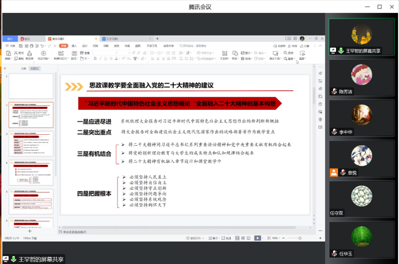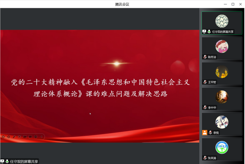 为深入学习宣传贯彻党的二十大精神,切实把全院师生的思想统一到党的二十大精神上来,推进党的二十大精神进教材、进课堂、进头脑,11月16日晚7点,马克思主义学院线上召开学习宣传贯彻党的二十大精神专题会议,学院党委书记曹继晨、院长李中华、副院长张英涛、任守双以及学院全体师生参加会议。