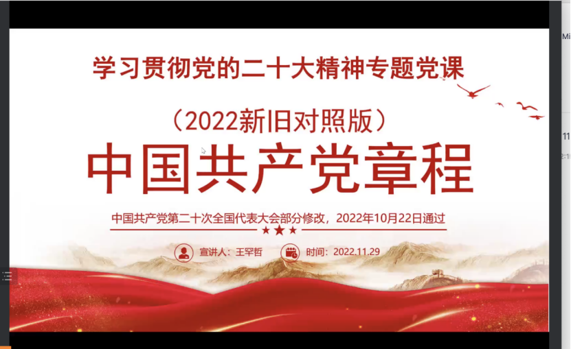 本次党课聚焦学习贯彻党的二十大精神这一核心内容和主线,从“党的二十大修改党章的重大意义”和“二十大党章的30个重要修改”两个部分对新修改的《中国共产党章程》进行学习。王罕哲带领支部同志逐字逐句对《中国共产党章程(修正案)》进行了学习,通过新旧版对照,详细解读了党章修改的内容及其意义内涵,引导大家全面、系统地理解掌握新党章内容,加深了大家对十九大以来党的理论创新、实践创新、制度创新成果的认识和把握。