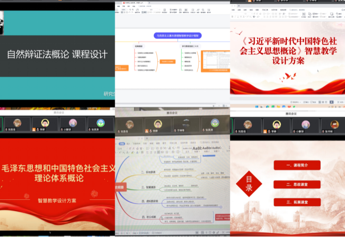 七位教师结合各个教研室的具体情况依次进行了分享。习近平新时代中国特色社会主义思想教研室陈芳洁老师通过三个板块分享了智慧教学设计方案,中国近现代史纲要教研室寇丹阳老师通过思维导图分享了利用智慧化教学手段促进教学改革的新思考,毛泽东思想与中国特色社会主义思想概论教研室张书彬老师运用“1+2+5”的模式汇报了其智慧教学设计方案,思想道德修养与法律基础教研室刘禹彤老师通过课程简介、思政课堂、拓展课堂三个角度分享了她对智慧教学的相关见解,研究生思想政治理论课教研室于雅迪老师分享了《自然辩证法》这门课的智慧化教学设计,马克思主义基本原理教研室邵铭浩老师的互动乐园、经典诵读等模块设计也带给老师们有益的启发。