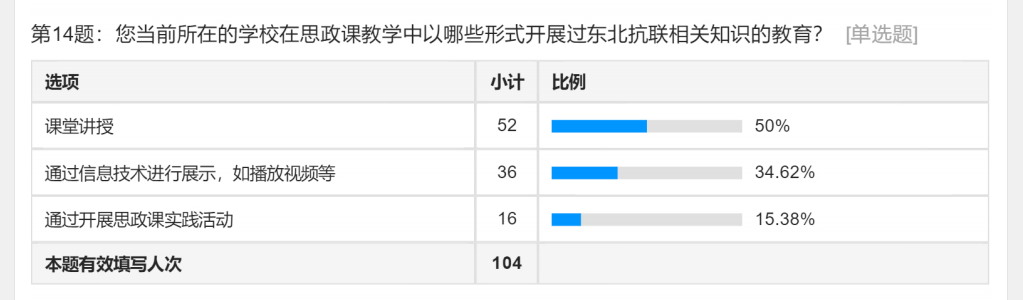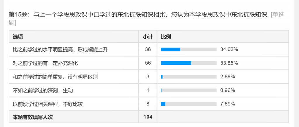 本次调研主要针对东北抗联精神融入大中小学思政课一体化教育的现状存在的问题进行全面评查,大中小学思政课一体化教育存在的不足包括对实践教学重视程度不够、教学内容的衔接有错位现象以及利用信息技术、大数据技术等新型科技,实现思政教育资源的多元整合的能力不足等问题。