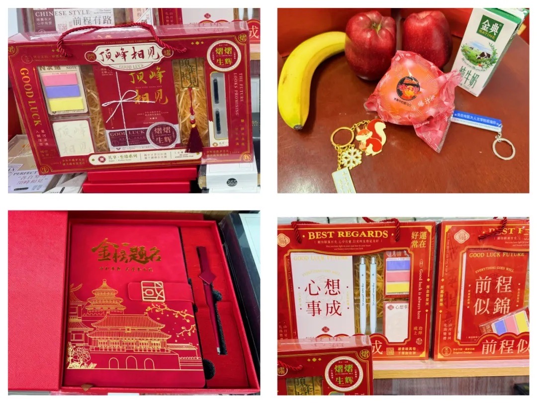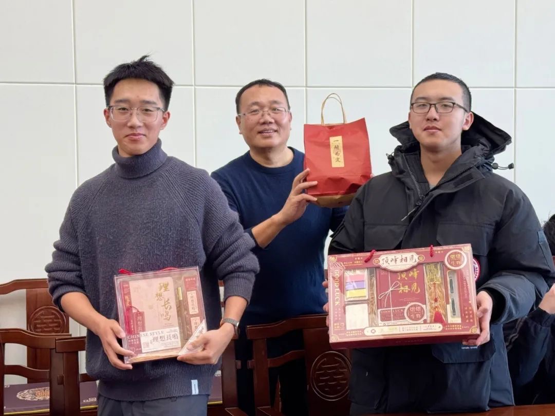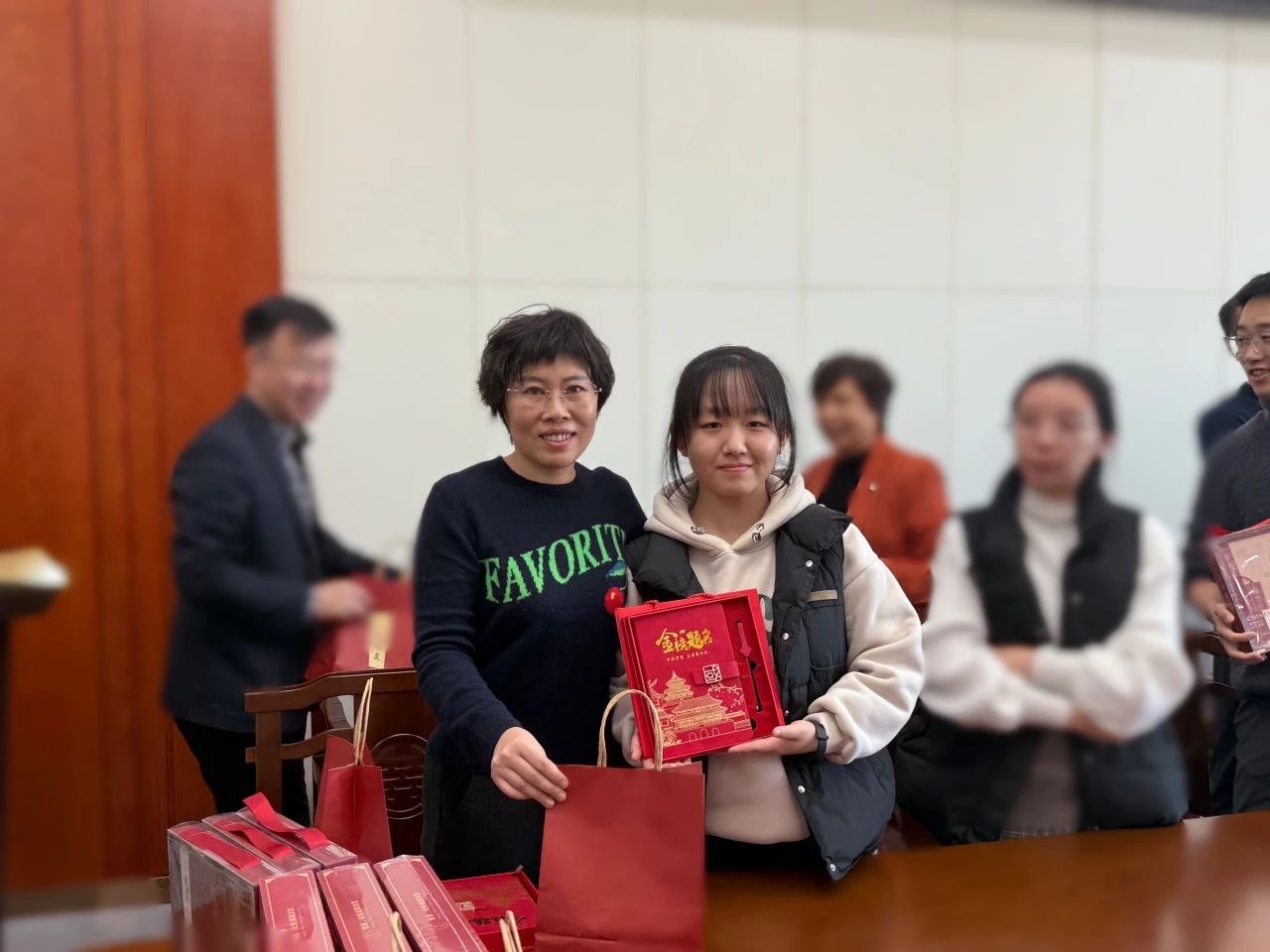尹梅院长向考研的同学们表达了学院领导与老师的关心,为同学们送出最诚挚的祝福,激励同学们稳住士气、坚定信心,在最后阶段注重学习与心理调适,以良好的精神风貌应考。黄永柏书记为学生们解读“加油包”中每份礼物蕴含的美好祝福:“橙子代表成功上岸,苹果代表平安顺利,牛奶代表动力十足、牛气冲天!文教礼盒代表笔锋所指、一战成名!”