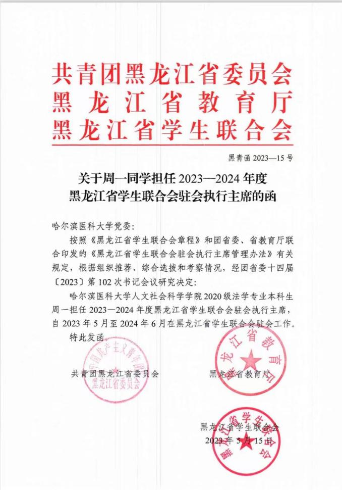 近日,共青团黑龙江省委员会、黑龙江省教育厅、黑龙江省学生联合会发函,《关于周一担任2023-2024年度黑龙江省学生联合会驻会执行主席》。