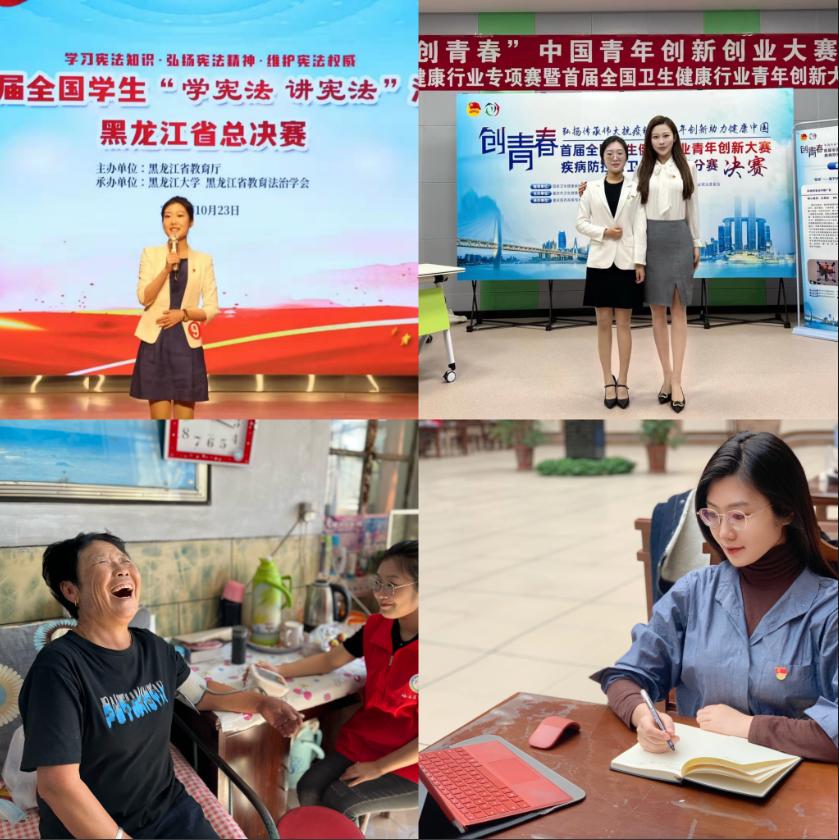 在学术科研领域,作为主持人,荣获第八届“创青春”中国青年创新大赛暨全国卫生健康行业青年创新大赛国家级银奖、第十三届“挑战杯”黑龙江省大学生创业计划竞赛省级银奖;作为核心成员,获批国家实用新型发明专利一项、省级科研立项课题两项。