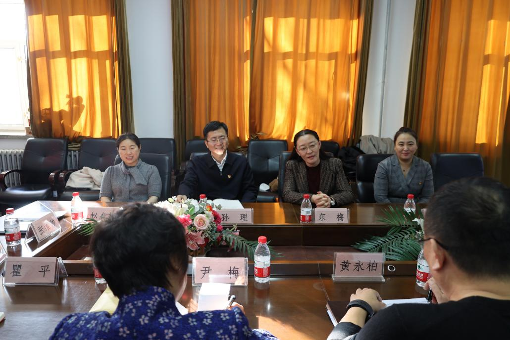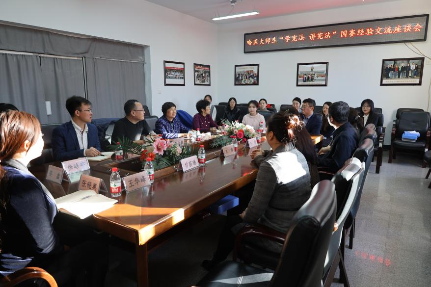 由教育部主办、全国青少年法治教育中心承办的第八届全国学生“学宪法 讲宪法”活动全国总决赛于近日结束,ac米兰官网中文网站人文社会科学学院法学专业学生在比赛中表现优异,获得全国一等奖一名,黑龙江省一、二、三等奖各一名的好成绩。为表扬优秀个人,同时总结经验以进一步提升竞赛水平,11月7日下午,学校党委副书记东梅、宣传部部长孙理、宣传部副部长乔蕤琳、学工部副部长赵春辉、宣传部宣传科科长王华峰一行莅临人文学院指导工作,开展以“学宪法 讲宪法”国赛经验交流为主题的座谈会。人文学院领导班子及大赛获奖学生代表、指导教师代表参加座谈。
