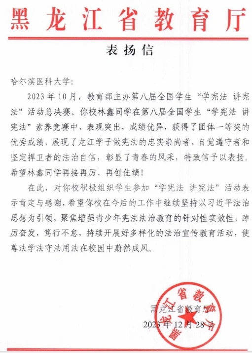 黑龙江省教育厅对我院林鑫同学在第八届全国学生“学宪法 讲宪法”素养竞赛中取得优异成绩致信表扬。