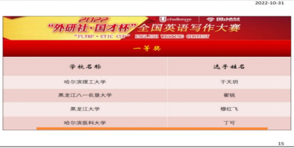 本次黑龙江省赛区决赛由黑龙江省教育厅主办,黑龙江省高等学校外国语言文学类专业教学指导委员会、黑龙江省高等学校大学外语教学指导委员会、外语教学与研究出版社协办。各项比赛内容充分考察并培养作为国际化人才所必须的语言能力、思维能力、跨文化交际能力、理性分析与辩证思考能力等多维度综合素养。