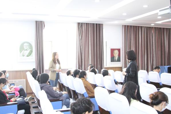 曹博教授通过分组游戏,“盲拼”完成积木作为切入点,强调团队学习和学习者亲自参与实践的学习方式的诸多优越性和重要性,接着曹教授以英语课程教学举例,以教育目的为统领,讲授通识课程教育的意义。曹教授指出,第一,课堂教学应当以学生的发展为中心,教师要注重学生的课程评价与反馈。第二,要与时俱进,更新教学理念,提高教学方法。可以通过文件、报告、教育教学公众号等多种途径获取学术前沿信息,提高教学质量。最后,曹教授通过“三个牢固树立”、“四有”好老师、“四个引路人”等方面梳理总结习近平总书记对教师的期望,强调教师要努力做精于‘传道授业解惑’的‘经师’和‘人师’的统一者。