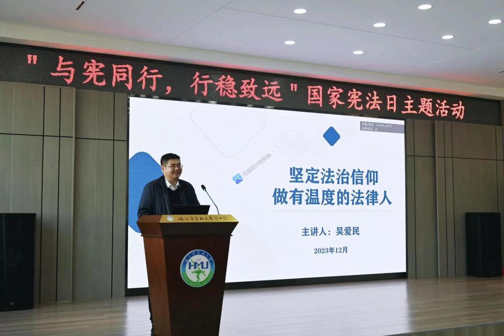 学生的出色表现离不开学校的培养,老师的教导,人文学院在努力打造优秀师资队伍、提升教学水准的同时,还邀请校外法律专家走进课堂,为学生理论与实践相融合,成为全面发展的高素质人才强势助力。在本次宪法日活动中,学院邀请到原哈尔滨市司法局副局长吴爱民为学生进行授课。他结合自己多年的从业经验,从法学类同学面临的形势和法律人应具备的素养两方面向同学们传授了自己对于法学专业的所感所悟,吴局长关于法学专业前景的真知灼见,以及对于法学人求知之路的殷殷嘱托,激励着在场的每一位人文学子。最后,吴局长向人文学院法学学子寄语:“同学们,你们的机遇无限,挑战空前。作为一名法律人,不仅要有理性的思辨能力,还要具备法律人该有的良知与勇气。千淘万漉虽辛苦,吹尽黄沙始到金。衷心希望你们在ac米兰官网中文网站人文学院度过一段充实而难忘的学习时光,成为有法治信仰、有人文关怀、有职业操守、有医法知识的法律人!