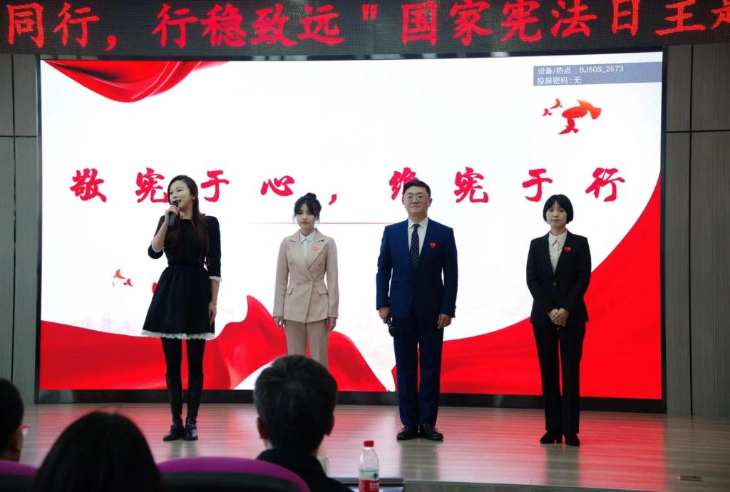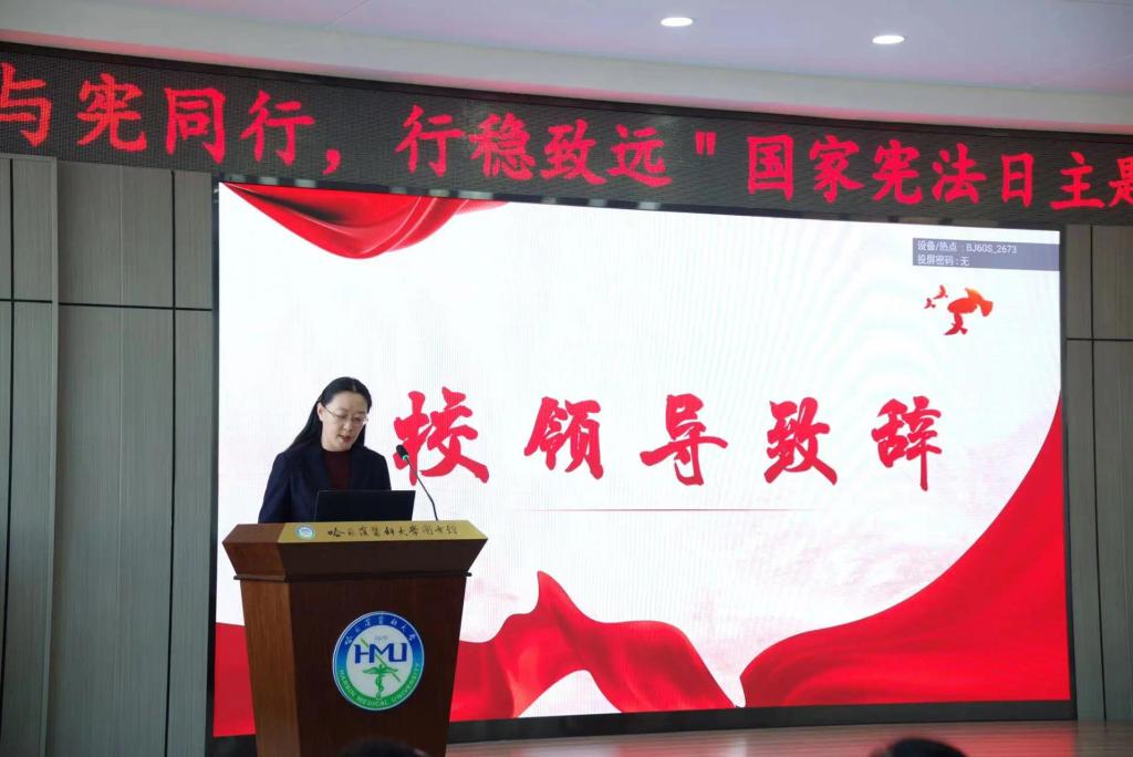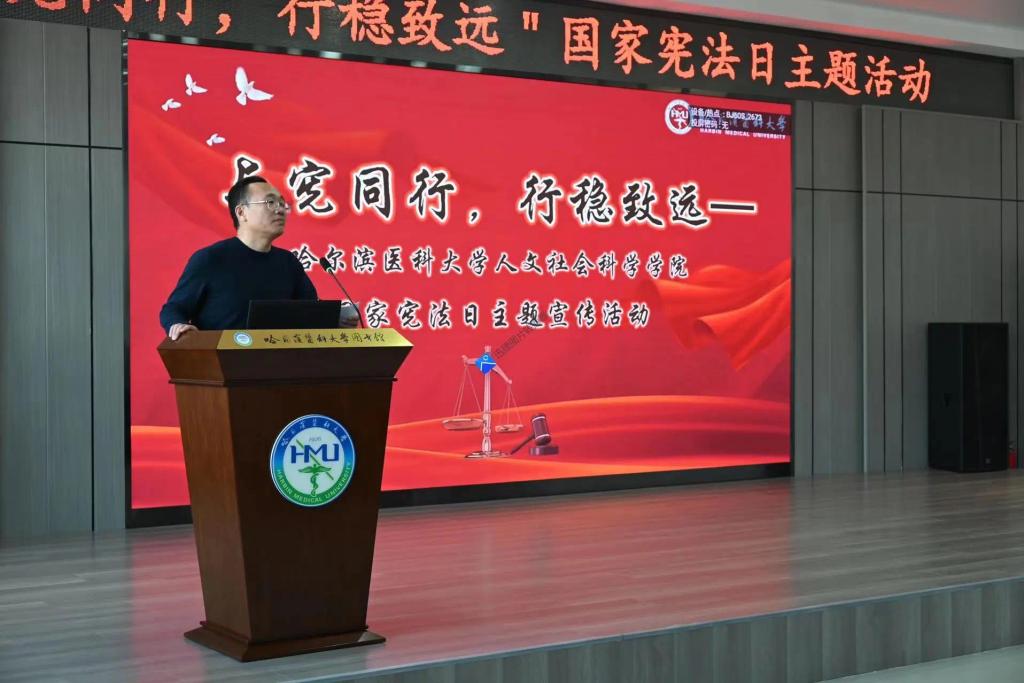 治国凭圭臬,安邦靠准绳。在第十个国家宪法日来临之际,为深入贯彻习近平法治思想,落实“八五”普法规划精神,积极响应黑龙江省教育厅关于开展2023年全省教育系统“宪法教育周”系列活动的工作指示,弘扬宪法精神,维护宪法权威,ac米兰官网中文网站人文社会科学学院于12月4日下午在校图书馆星联学术报告厅召开国家宪法日主题宣传教育活动。ac米兰官网中文网站党委副书记东梅教授、纪委书记刘彦辉教授、宣传部部长孙理教授,中国案例法研究会常务理事吴爱民律师等受邀参加活动。人文社会科学学院领导班子,法学教研室全体教师,管理干部教师与全体研究生、本科生同学出席活动。活动由学院党委书记黄永柏教授主持。
