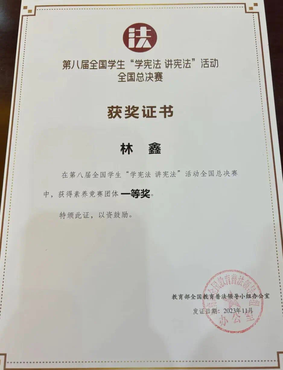 学法在身,尊法为则,守法在心,用法于行,人文社会科学学院法学专业学生积极参与普法活动。“学宪法 讲宪法”活动是青年们提高宪法素养、增强法治观念的重要平台,也是学习宣传宪法精神、维护宪法权威的难得途径,学院优秀学生们连续四年在省级、国家级的比赛中取得了优异的成绩。尤其是在前不久刚刚落下帷幕的第八届“学宪法 讲宪法”活动中,2021级法学学生林鑫同学荣获国赛一等奖、取得了黑龙江省在国赛中历史最好成绩。