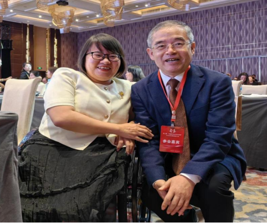当张学院士在会场看到零壹罕见骨病专项基金创始人孙月的时候,主动走到她身边询问近况,并俯下身子与她亲切合影。
