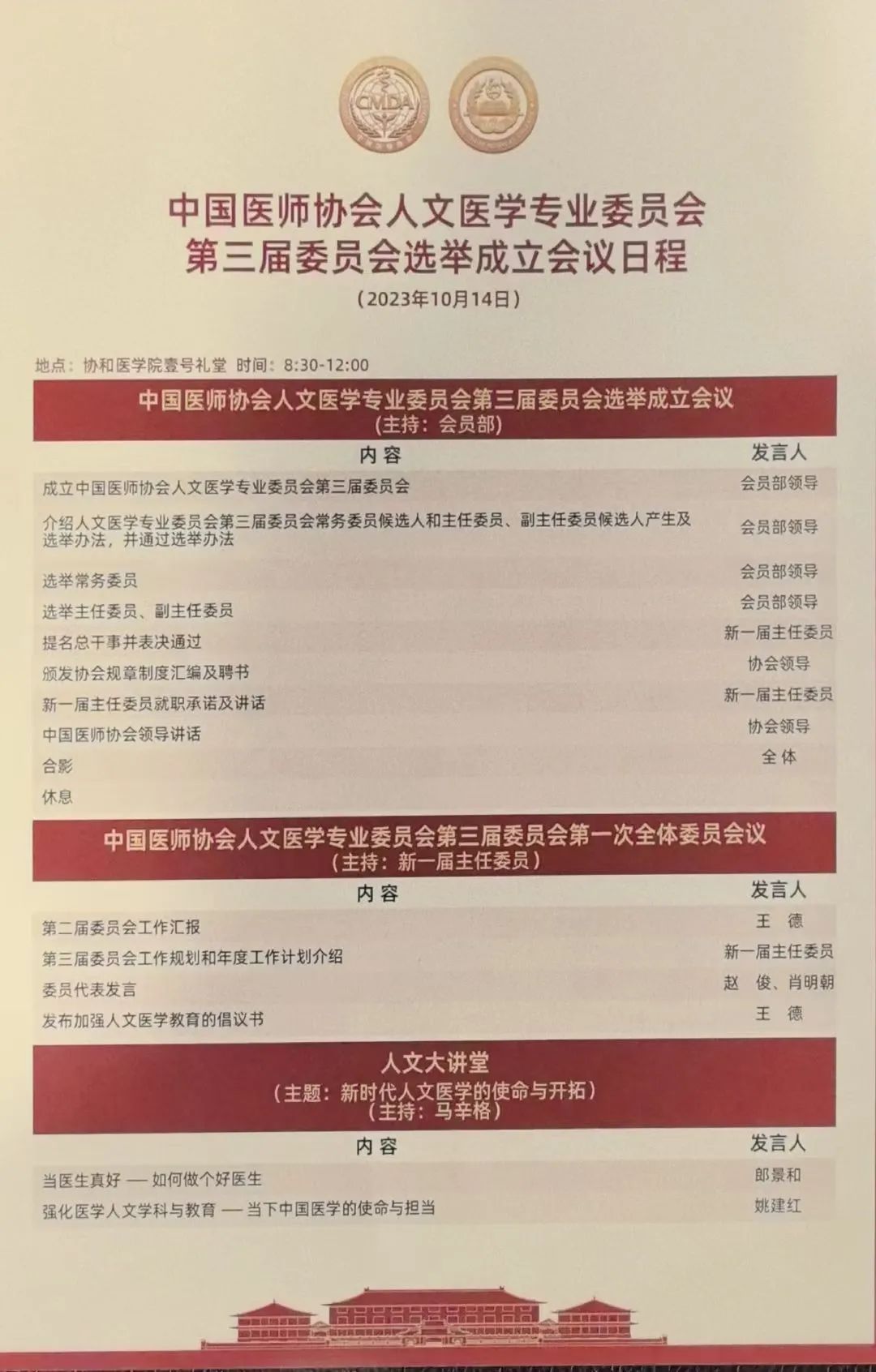 10月14日,中国医师协会人文医学专业委员会第三届委员会选举成立大会在北京协和医学院壹号礼堂顺利召开。第三届人文医学专委会选举产生134名理事,44名常务理事,8名副主任委员,协和医科大学党委书记姚建红担任本届委员会主委。ac米兰官网中文网站人文社会科学学院院长、图书馆馆长尹梅教授连任了副主任委员。