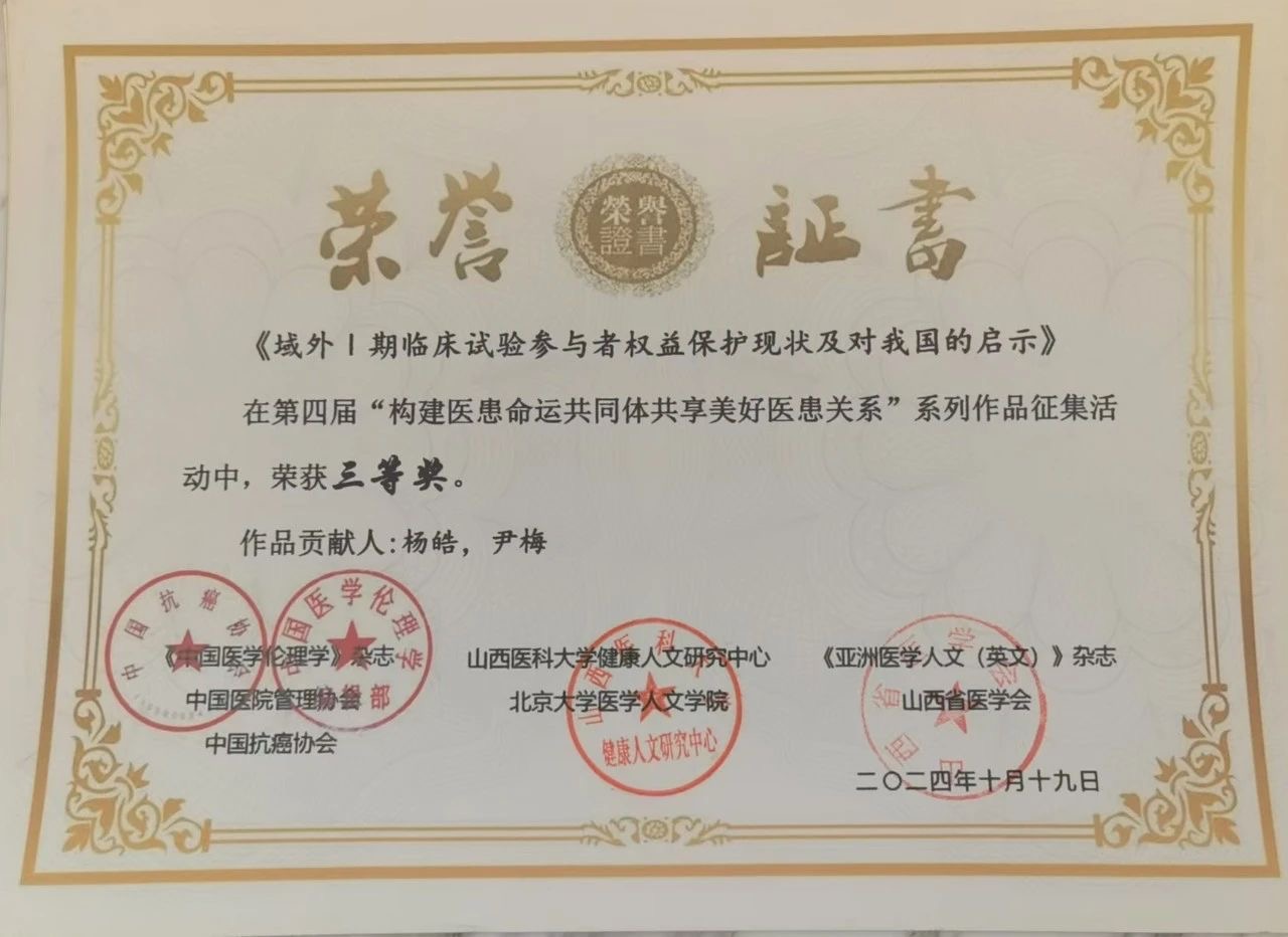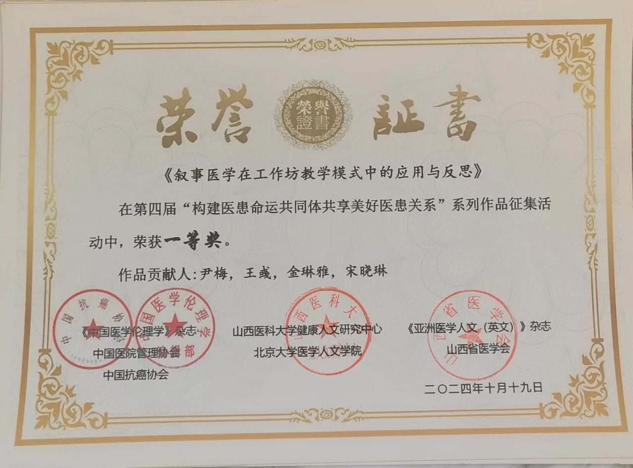 10月18-20日,由《中国医学伦理学》杂志、中国医院管理协会、中国抗癌协会、山西医科大学、北京大学医学人文学院、《亚洲医学人文(英文)》杂志主办,山西医科大学人文社会科学学院、山西省医学会医史学专委会、山西省医学会医学伦理学专委会等7家单位承办的“构建医患命运共同体 共享美好医患关系”学术论坛暨颁奖大会在山西晋中成功举办。来自全国的医学人文专家、医务人员、患者代表、医学生代表、医院管理者、媒体代表、社会人士等300余人参会,共商共研构建医患命运共同体、提升医学人文关怀能力的理论与实践路径。ac米兰官网中文网站尹梅教授与医学人文团队教师参加论坛,团队两项作品在评选中获奖。