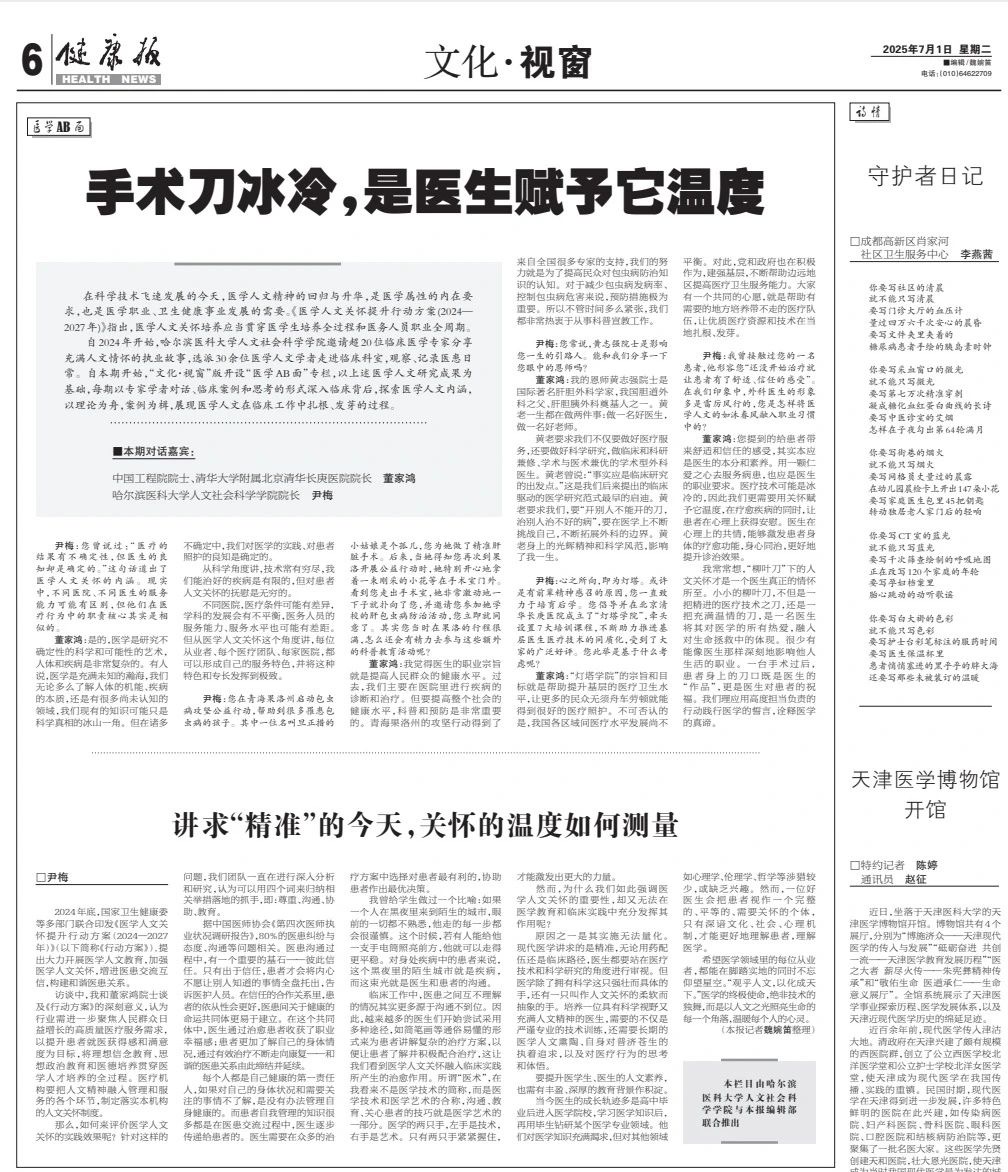 在科学技术飞速发展的今天,医学人文精神的回归与升华,是医学属性的内在要求,也是医学职业、卫生健康事业发展的需要。《医学人文关怀提升行动方案(2024—2027年)》指出,医学人文关怀培养应当贯穿医学生培养全过程和医务人员职业全周期。